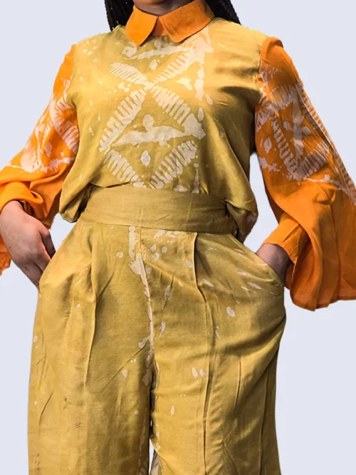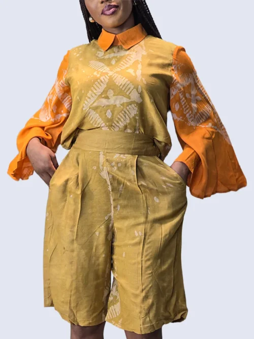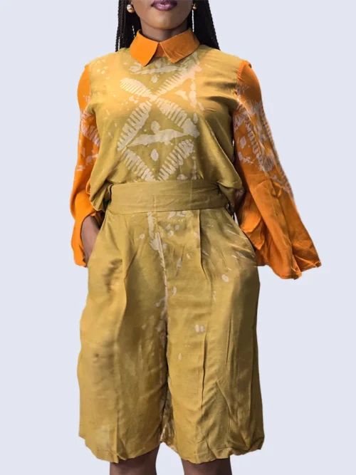 Cet ensemble en 100 % coton célèbre l’authenticité et le savoir-faire artisanal africain. Le tissu, entièrement confectionné à la main, fait que chaque pièce reflète un travail unique, où les motifs et les nuances de couleurs racontent une histoire riche de culture et de tradition. Composé d’un haut fluide à effet portefeuille et d’un short ample à taille élastique, cet ensemble offre une silhouette à la fois confortable et élégante. La coupe décontractée sublime le mouvement, tandis que le tissu en coton léger assure une sensation de fraîcheur et de douceur sur la peau. Les teintes chaleureuses apportent caractère et originalité, faisant de chaque tenue une pièce forte et distinctive.
