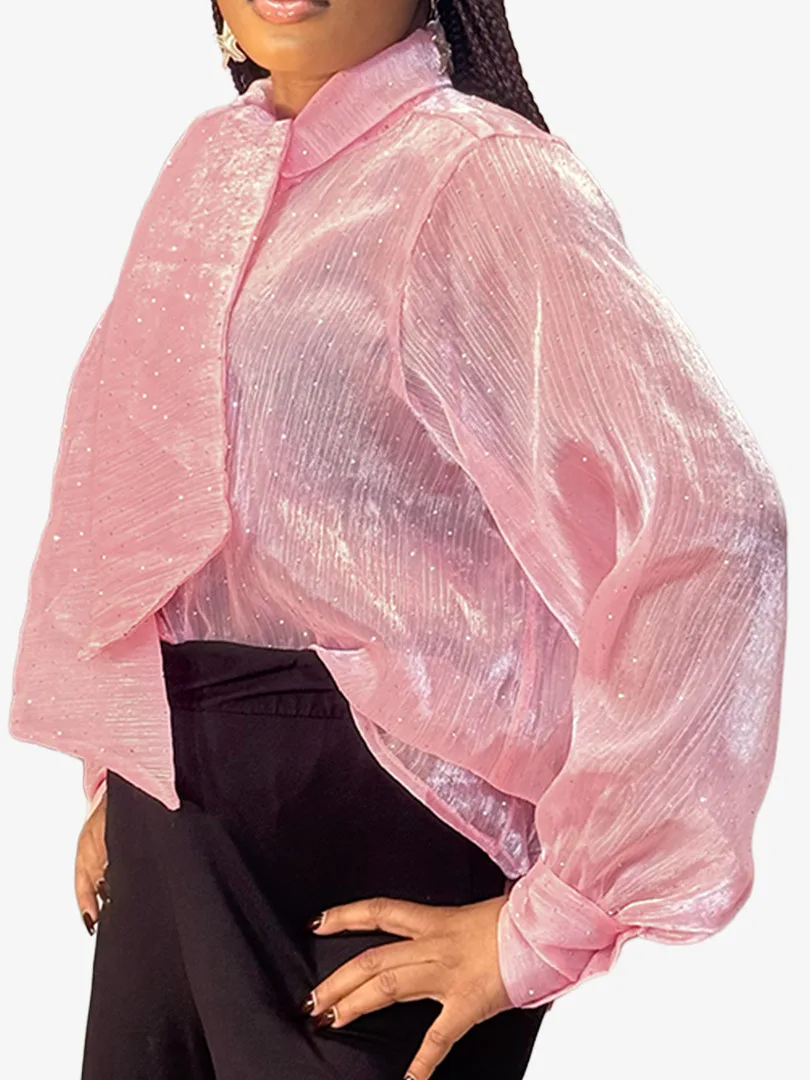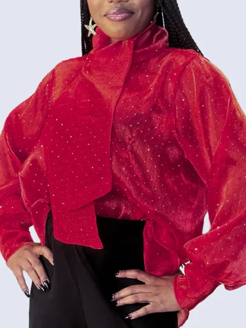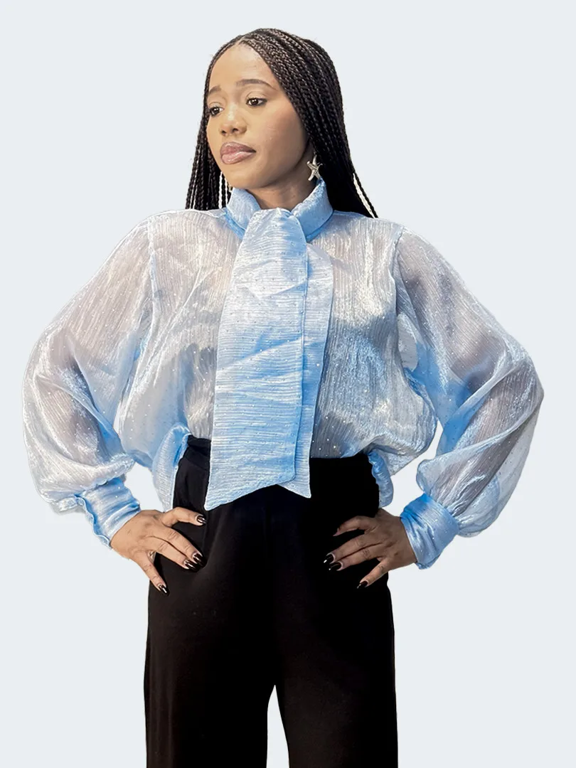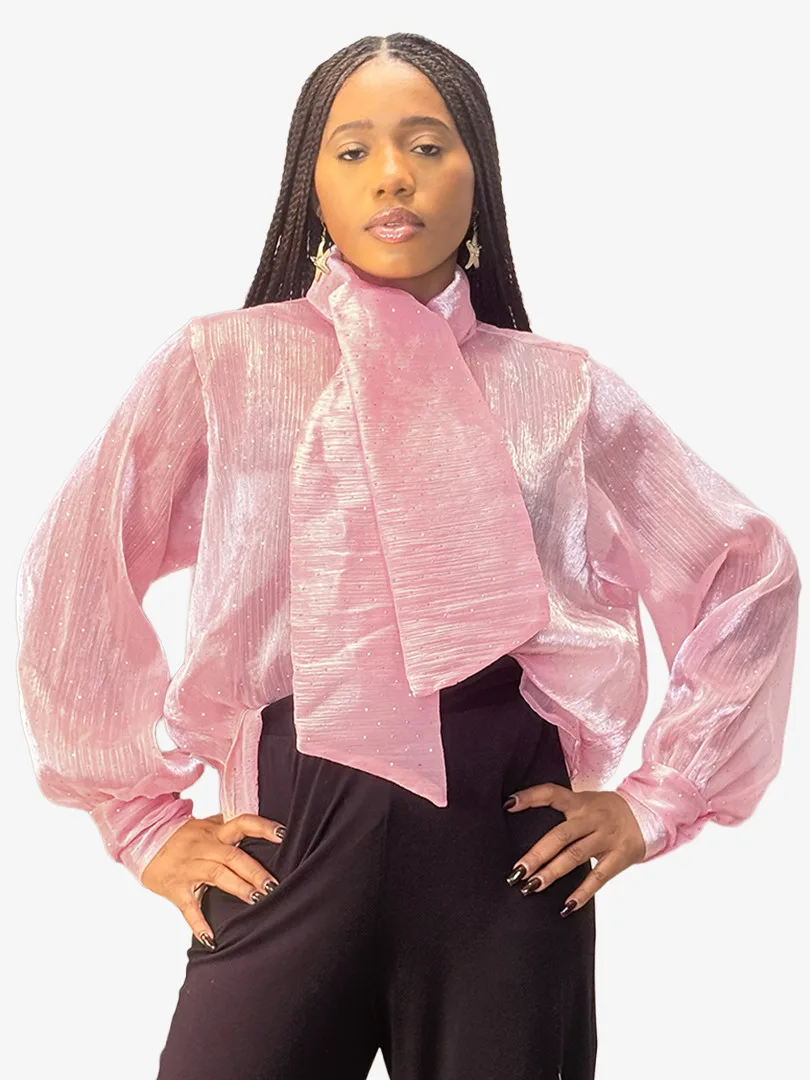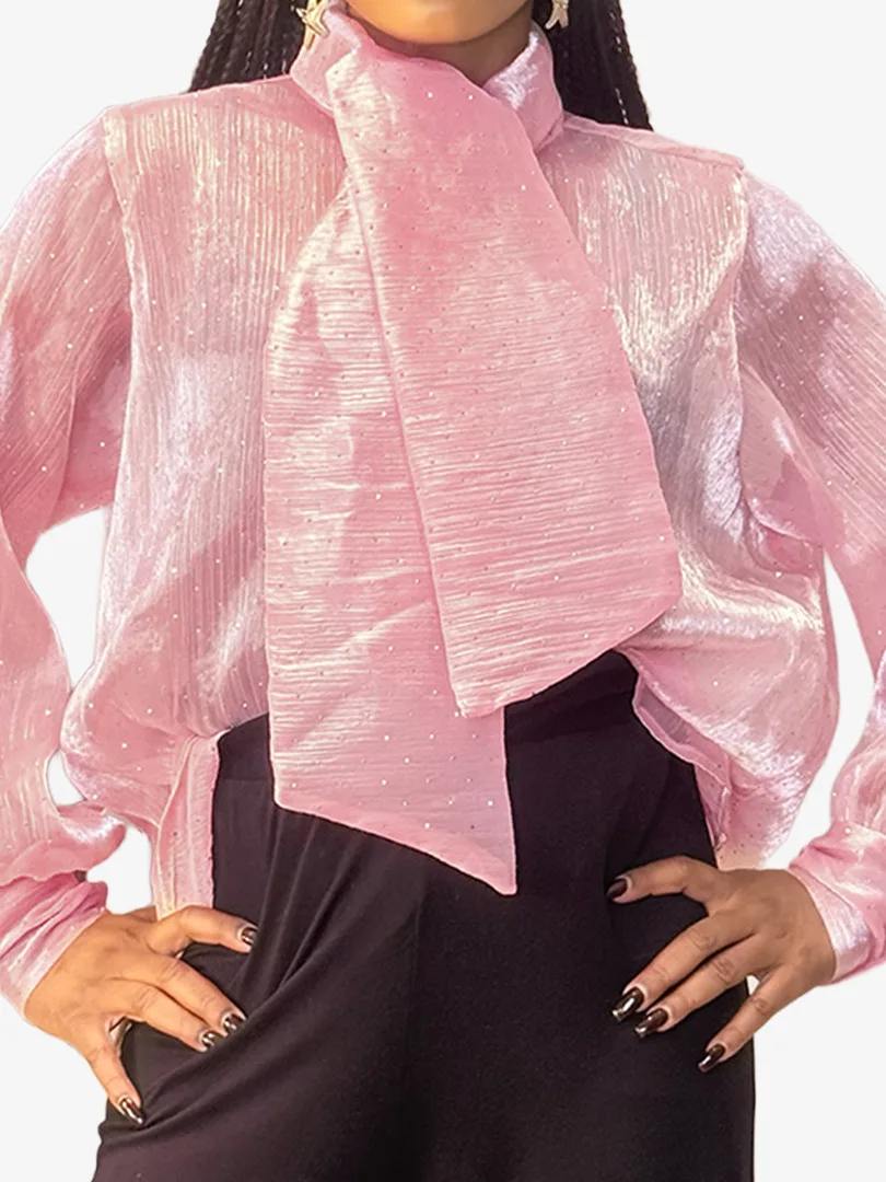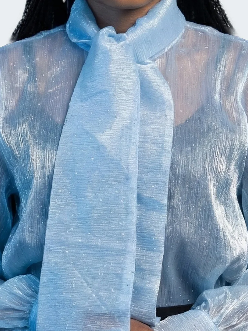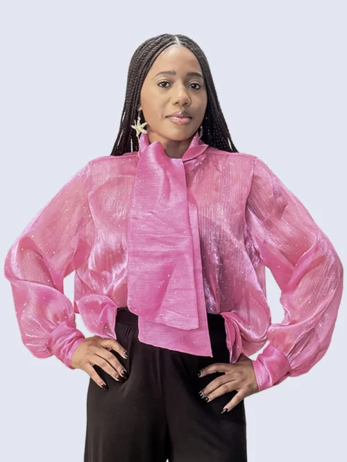 Ce chemisier incarne une élégance délicate rehaussée d’une touche lumineuse. Confectionné dans un tissu crêpe léger et vaporeux, il offre un tombé fluide qui épouse le mouvement avec grâce. Ses manches longues apportent une allure raffinée et aérienne, tandis que les fines paillettes délicatement intégrées au tissu captent la lumière avec subtilité, créant un effet scintillant discret et sophistiqué. La transparence légère de la crêpe ajoute une dimension sensuelle tout en restant élégante, parfaite pour un look à la fois chic et moderne.