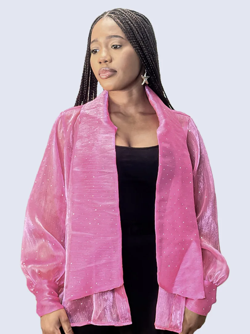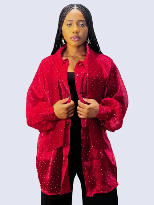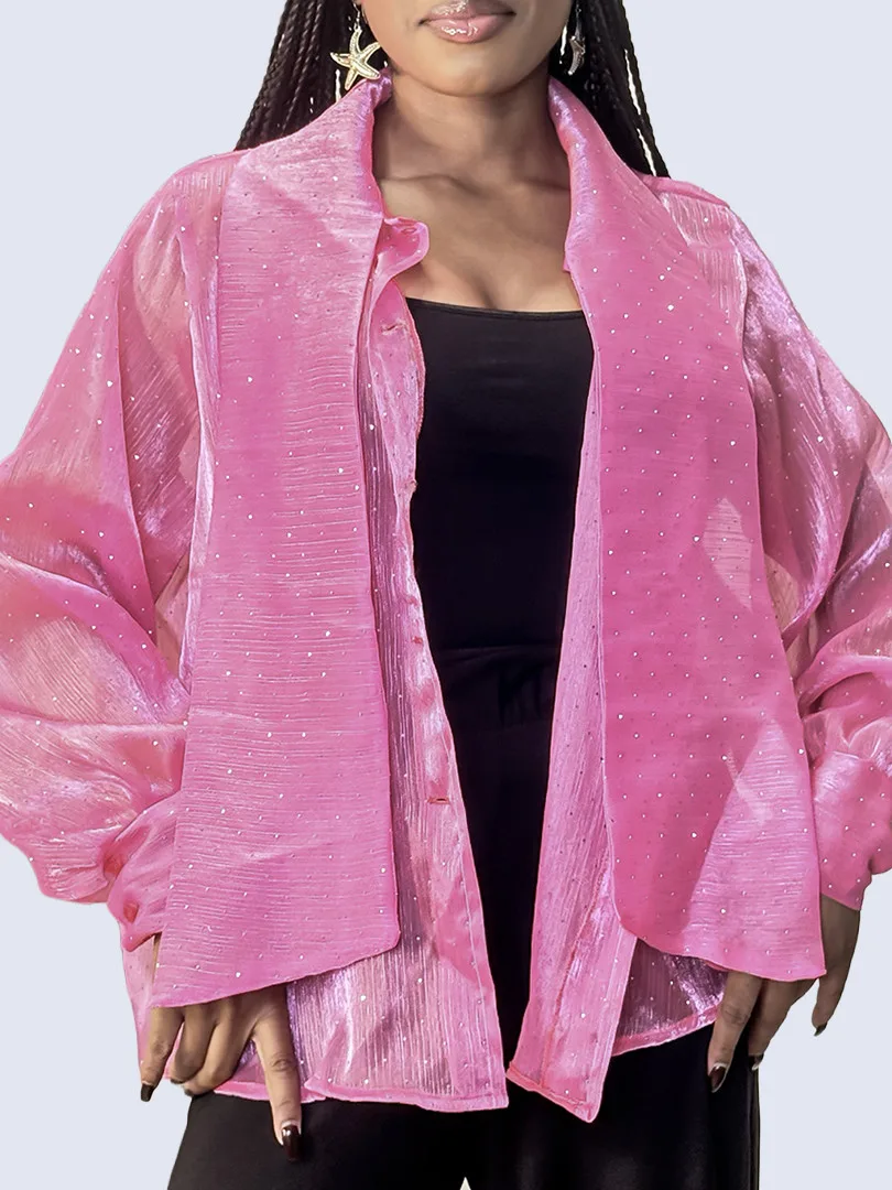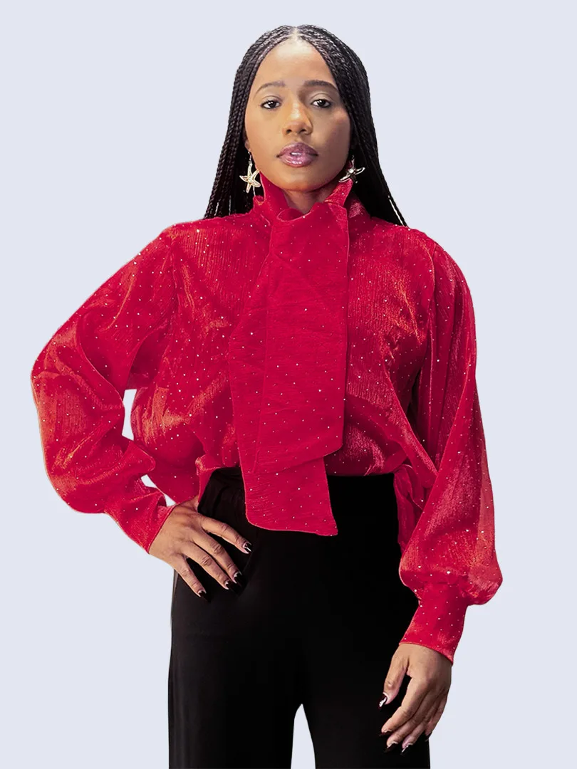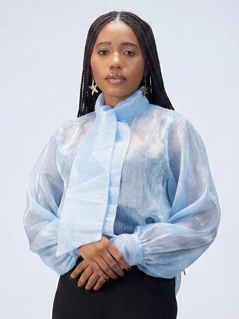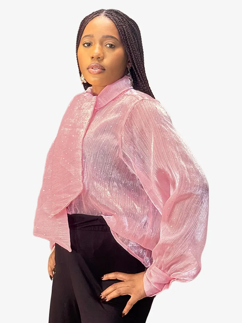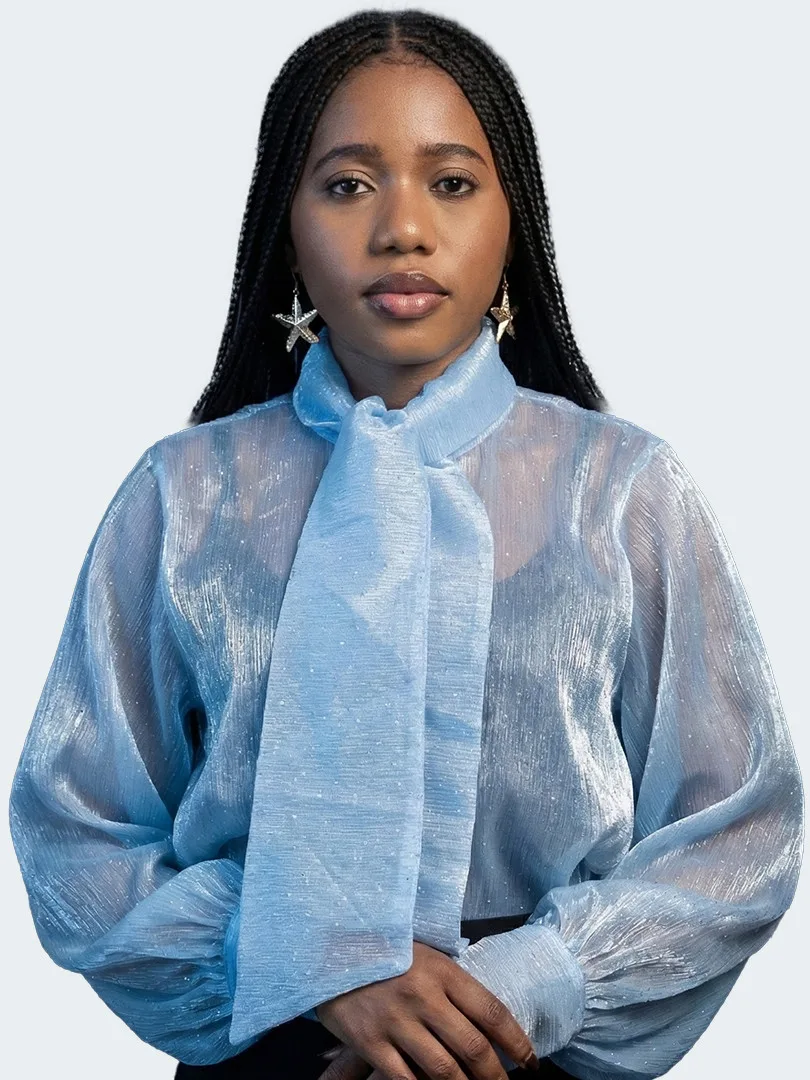 Ce chemisier incarne une élégance délicate rehaussée d’une touche lumineuse. Confectionné dans un tissu crêpe léger et vaporeux, il offre un tombé fluide qui épouse le mouvement avec grâce. Ses manches longues apportent une allure raffinée et aérienne, tandis que les fines paillettes délicatement intégrées au tissu captent la lumière avec subtilité, créant un effet scintillant discret et sophistiqué. La transparence légère de la crêpe ajoute une dimension sensuelle tout en restant élégante, parfaite pour un look à la fois chic et moderne.